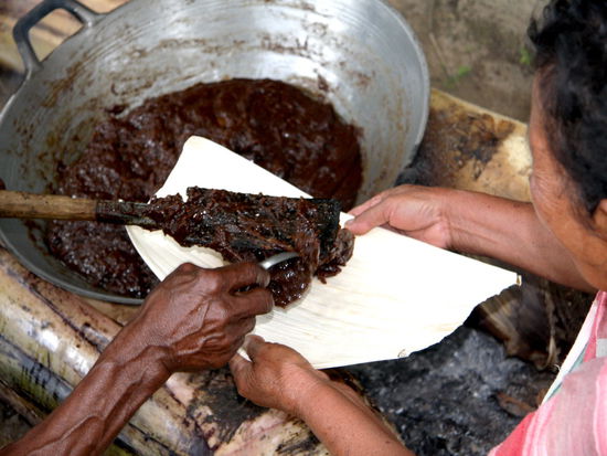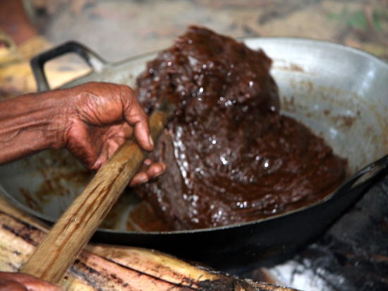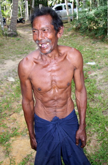 Praktisch keiner der Einwohner kann auch nur ein Wort Enlisch. Das lustige bei Thailaendern ist, wenn sie einen nicht verstehen oder auch nur ein Wort nicht verstehen, plappern sie genau das nach was man gesagt hat und das natuerlich mit dem nie endenden breiten Laecheln und eifrigem Kopfnicken. Ueberall wo man durchfaehrt winken die Kinder, lachen, wollen einen Anfassen und alle wollen fotographiert werden. Die Leute sind so herzlich hier, das ich nur noch ein riesiges, glueckliches Grinsen zustandebringe. Irgendwann beschliessen wir einem der vielen Schotterwege zu folgen die irgendwo ins Niemandsland zu fuehren scheinen und kommen unversehens zu einer Familie die mitten in der Pampa sehr idyllisch am Meer lebt. Zuerst wollen wir nicht stoeren und uns auf den Rueckweg machen (typisch europaeische Denkweise) doch dann kommen zwei Maenner rueber die uns einladen uns doch dazuzusetzen. Sie haben ein Feuer zwischen zwei Palmenstaemmen, einen Wok darueber und darin wird eine seeeeeeehr dubios aussehende, dunkelbraune Masse geruehrt, von der ich lieber nicht zu genau wissen will was es ist. Auch hier kann niemand Englisch aber es gibt ja noch Haende und Fuesse und so klappt die Kommunikation ohne nennenswerte Probleme. Wahrscheinlich reden dabei alle aneinander vorbei, aber wenn man merkt dass das der Fall ist wird wieder gelacht. Gelacht wird so wiso immer, auch dann wenn jemandem etwas peinliches passiert und zwar damit die entsprechende Person nicht zu sehr in Verlegenheit geraet. Ich bekomme eine Thaizigarette, welche sie aus Bananenblaettern drehen (natuerlich mit Tabak) und die ich eigentlich noch gern habe. Habs aber erst einmal hingekriegt mir so ein Ding selber zu bastel. Nun gut. Zurueck zu der verdaechtigen Masse. Wir versuchen rauszufinden was es ist. Und irgendwann kommt raus, es ist eine Art Caramel. Mir wird etwas davon angeboten und rein schon aus Hoeflichkeit kann ich nicht nein sagen. Bin natuerlich doch auch etwas neugierig. Also rausgeschoepft, die Pampe kommt auf ein Bananenblatt und dann gehts ans probieren. Schmeckt gar nicht so uebel. Wir probieren der Reihe nach, muessen natuerlich nocht 10 mal bestaetigen dass es uns schmeckt und dann sind alle zufrieden. Es ist wirklich ein schoener und lohnenswerter Ausflug der umso lohnenswerter ist, als er praktisch nichts kostet.