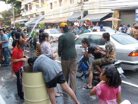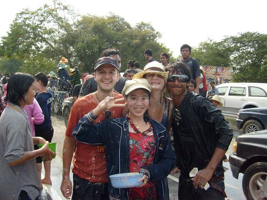 Was fuer eine Gaudi, so was hab ich noch nie erlebt. In der ganzen Stadt herrschte Ausnahmezustand! Ueberall standen die Locals mit Schlaeuchen, Wasserpistolen, riesigen Eimern und einer Art Kreide bewaffnet. Wir ham uns dann ein Bike ausgeliehen und sind den ganzen Tag einfach nur durch die Stadt geduest. Ich war noch nie so nass in meinem Leben wie dort. Aber bei der Hitze war es wirklich eine wohltuende Abkuehlung. Standen dann auch ein paar Stunden bei so ein paar Locals und ham dann mit denen zusammen die anderen Locals nass gemacht, den von irgendwelchen anderen Farangs (Touris) fehlte jede Spur. Ach, die Thais sind ja echt putzig!