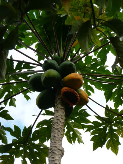 Von Vilcabamba aus eine Stunde Bus fahren nach Tumjanuhma und dann noch ne Stunde durch die Berge laufen. Um so öfter ich den Weg laufe um so kürzer erscheint er mir. Dann auf der Farm angekommen, könnt ihr zwei kleine und einen grossen Garten finden. Und überall Obst, das einfach nur gepflückt, bzw. vom Boden aufgehoben werden muss. Da hätten wir 3 Arten von Avocado, Rote Pflaumen, Maracuja, Rosenapfel (keine Ahnung wie das in Deutsch heisst, schmeckt jedenfalls nach Rosen), Limonen, süsse Limonen, Grapefruit, Apfelsinen, Orangen, Brombeeren und super leckere Papaya. Papaya von den Bäumen runterzupiecksen ist schon eine Kunst für sich.