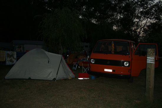 Als wir unseren Platz bezogen hatten, und uns zur Abkühlung ans Meer begaben, sahen wir fast nur Schweizer auf dem Campingplatz. Totale Invasion.