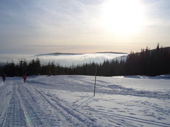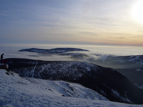 Da zwei von uns keine Seilbahn fahren (ich inbegriffen) haben wir uns in unserem Winterurlaub im Dezember 2007 zu Fuß auf den Weg gemacht. Sechs vollkommen untrainierte Couch-Potatoes auf dem Weg nach oben. Das Wetter war optimal - Sonne und kaum Wind. Um uns ein wenig zu schonen, haben wir uns erstmal mit einer Mini-Pistenraupe zur Výrovka-Bouda fahren lassen. (Der Fahrer sagte, von da aus wäre es noch eine Stunde Fußweg. Na, schauen wir mal.) Dort angekommen, waren wir überwältigt von der Aussicht über den Wolken.