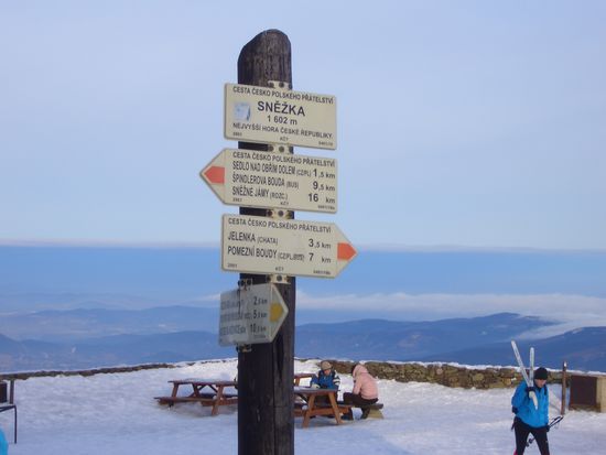 Wir entschlossen uns abzukürzen und zwar auf direkten Weg zur Schneekoppe. Ein paar Fußspuren sagten uns, daß wir nicht die ersten mit dieser Idee waren. Nach kurzer Zeit merkten wir aber, das der Weg wohl doch nicht so gut war, weil wir bei jedem Schritt ziemlich tief im Schnee versanken. Das Gehen wurde immer schwieriger. Aber jetzt wollten wir nicht mehr zurück. Das Ziel im Auge gelangten wir irgendwann wieder zurück auf den Schustlerova(Schusterweg), wo mittlerweile viel Betrieb war.