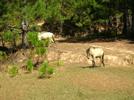 Langsam stiegen wir hinauf. Wir liefen durch einen riesigen Laerchenwald. Staendig trabten uns kleine Pferde entgegen, blieben kurz stehen und trabten dann weiter.