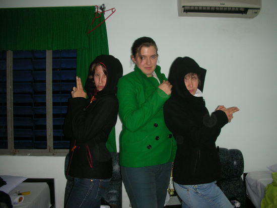 Zurueck im Hotelzimmer brach aus uns die Uebermuedung der letzten Packnacht hervor: Das doofe Lied unseres Schnorcheltripp-Fuehrers von Nha Trang lief uns so lange nach, bis Rafaela es lautstark zum Besten gab und Christina und Irene sich vor Lachen kaum mehr halten konnten. Das Ganze gipfelte schliesslich in einer Modeschau, wo wir unsere neu erworbenen Jacken zum besten gaben.