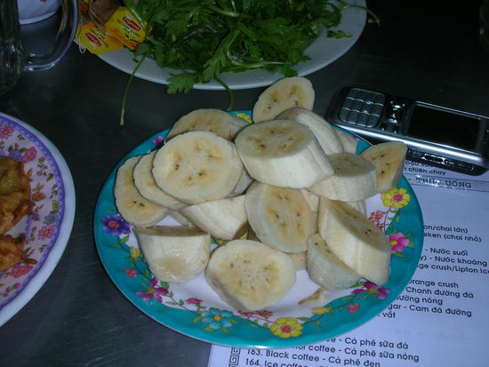 Bezueglich Essen befolgten wir das erste Mal einen Tip unseres Reisefuehrers und landeten in einem einfachen, von Taubstummen gefuehrten Lokal. Unser Abendmenue war riesig, billig und einfach fantastisch. Wir genossen lokale Spezialitaeten von Hue und lachten so viel wie noch nie in diesen Ferien (und das alles ohne Alkohol!) Vor allem stellte sich der bestellte Fruchtsalat als reiner Bananensalat heraus, der in unseren ueberaus vollen Baeuchen fast keinen Platz mehr fand.