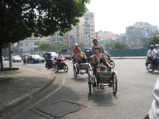 Spaeter buchten wir in einem kompetenten Travel Info Center neben dem Reconciliation Palast bereits den Flug von Hanoi nach Siem Reap (Angkor). Problematischerweise funktionierte der Kreditkartenleser nicht und der einzige ATM-Automat in der Naehe hatte kein Geld mehr. Dies fuehrte schlussendlich dazu, dass ich auf dem Ruecksitz eines Rollers zwischen hunderttausend anderen Toefflis, Autos und Bussen zum Airline-Buero flizte, waehrend mir der viel zu grosse Helm dauernd uebers Gesicht rutschte.