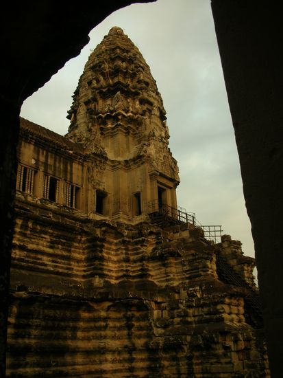 Innerhalb der ersten Mauer setzten wir uns zusammen mit den anderen Touristen auf eine Treppe unter freiem Himmel und hielten den Blick unentwegt auf das Innere des Tempels gerichtet. Zuerst sahen wir gar nichts; dann wurde der Himmel langsam grau und am Horizont traten die Umrisse der fuenf Haupttuerme Angkor Wats aus dem Nichts auf. Noch war in der Daemmerung kaum etwas zu erkennen, und alle unsere Fotos wurden durchgehend schwarz. Doch je heller es wurde, desto mehr nahmen die Tuerme klarere Konturen an und schon bald waren sie vollstaendig ins Sonnenlicht getaucht. Zwar war es nicht der gluehend rote Sonnenaufgang, den wir uns erhofft hatten, aber dennoch ein beeindruckendes Schauspiel. Nach einer Weile wanderten wir auf der langen Steinstrasse, die sich etwa zwei Meter hoch erhob und die riesige offene Flaeche teilte, zum Innern des Tempels. Dort bestaunten wir die Reliefs, Saeulen und Statuen und fotografierten alles, was uns vor die Linse kam.