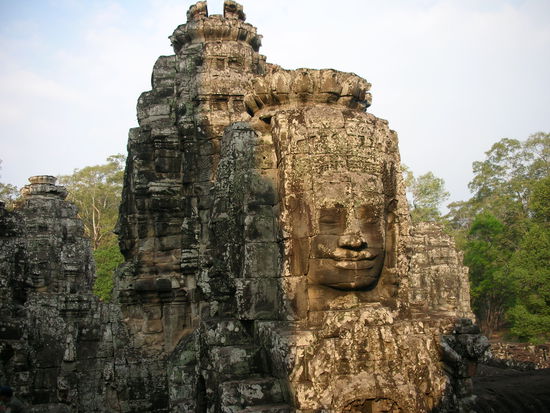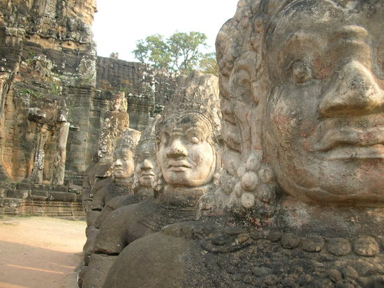 Als wir vom Tempel zurueckkehrten, bereitete es uns einige Muehe, unseren Tuctuc-Fahrer wiederzufinden. Fuer uns gleichen sich die Asiaten wie ein Ei dem anderen - und fuer die Tuctucs gilt uebrigens dasselbe. Schliesslich kam er winkend auf uns zu und die Fahrt konnte weitergehen. Er brachte uns nach Angkor Thom, einem ausgedehnten Komplexaus mehreren Tempeln, die allesamt von einer grossen Aussenmauer umgeben waren. Zum Tor in dieser Aussenmauer fuehrte eine Allee, die beidseits von schweren Steinstatuen gesaeumt wurde. Links standen die Goetter, rechts die Daemonen, und jede Statue hatte ihren individuellen Gesichtsausdruck.