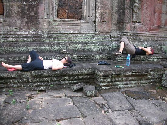 Wir erklommen um die Mittagszeit die Treppe eines Tempels. Stellvertretend fuer alle anderen Treppen in Angkor war sie horrend steil (Skipisten sind dagegen harmlos). Ihre Stufen waren ca. 40cm hoch, jedoch nur 10 bis 20cm tief und zudem gefaehrlich schraeg abgewetzt. Schon beim Hinaufklettern lief uns der Angstschweiss herab, ans Hinuntersteigen wollten wir gar nicht erst denken. Zum Glueck fanden wir auf der Rueckseite des Gebaeudes eine mit einem touristenfreundlichen Gelaender ausgestattete Holztreppe. Irgendwann forderten das fruehe Aufstehen und die Kletterei in der Hitze ihren Tribut und wir hielten im Schatten einer verfallenen Mauer einen 20minuetigen power nap.