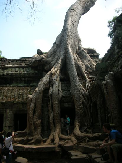 Spaeter kamen wir zu einem Tempel, der uns ungemein faszinierte. Nur wenige seiner Tuerme standen noch, ueberall hingen Schilder, die das Betreten von einsturzgefaehrdeten Kuppeln und Torboegen verboten. Die Mauern waren mit einem merkwuerdig tuerkisfarbenen Moos bewachsen und von der Natur in ihre Gewalt gebracht worden: Grosse Urwaldriesen mit weisser Rinde hielten mit ihrem Wurzewerk die Steinbloecke fest umschlungen. Manche von ihnen hatten Mauern sogar gaenzlich gesprengt und manchmal schienen sie einfach direkt aus dem Tempeldach hinauszuwachsen. Hier wurde deutlich, dass die Natur immer den laengeren Atem hat, ganz egal wie hart die Menschen sich zu verewigen versuchen.