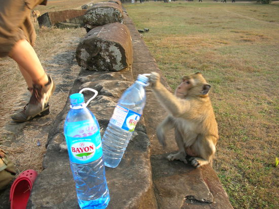 Puenktlich zum Sonnenuntergang waren wir wieder in Angkor Wat, dem groessten Tempel. Als wir uns auf einer niedrigen Mauer niederliessen und warteten, stattete uns ein ungebetener Gast einen Besuch ab: Ein Affe (wir wissen nicht, was fuer einer das war) kam zu uns gelaufen und schnappte sich stinkfrech unsere Wasserflasche. Rafaela schrie auf und er wich zurueck, doch dann knurrte er uns wuetend an und wollte zum Angriff uebergehen. In Gedanken sahen wir ihn bereits mit unseren Taschen (Handys, Paesse, Portemonnaies, ...) im Urwald verschwinden. Da wir uns zuvor gegen Mueckenschwaerme hatten wappnen wollen, hielt ich noch immer meinen Antibrummspray in der Hand - was haette ich schon tun sollen? Ich sprayte dem Affen das stinkende Zeug entgegen, doch er zeigte sich unbeeindruckt und fletschte stattdessen laut fauchend seine langen Eckzaehne.