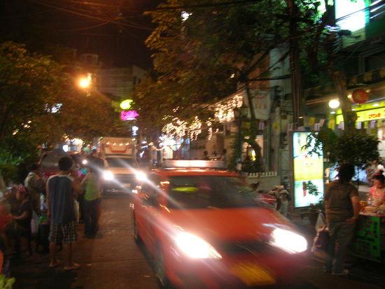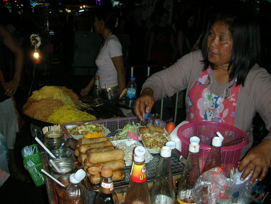 Weiter ging es in das Nachtgetuemmel. Wir waren begeistert. Ueberall standen kleine Staende, die Wuerste, Spiesschen, Nudeln, Pancackes, Fruechte und Fruchtshakes und vieles mehr anboten. Die Laeden und Shops waren vollgestopft: T-Shirts, Jeans, Schmuck, Schuhe, wohin das Auge auch nur reichen konnte. Euphorisch schlenderten wir durch das Getuemmel, assen Fruehlingsrollen und Thai-Nudeln und genossen die gute Atmosphaere.