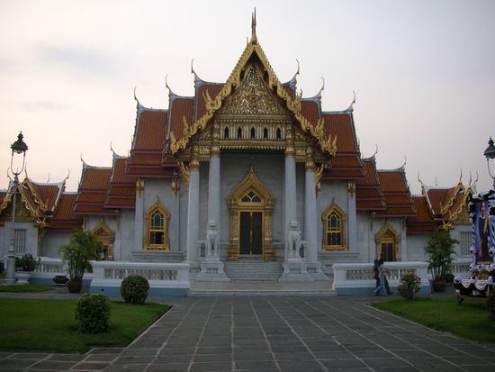 Wenig spaeter standen wir vor einem Marmortempel, der mit Gold, Steinen und Spiegeln verziert war. Im Innern beteten Moenche.