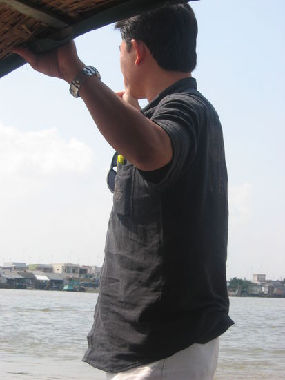 Auch dieser Tag begann mit einem fruchtigen Fruehstueck, danach checkten wir aus dem Hotel aus. Irene und Rafi verhandelten geschickt mit dem Rezeptionisten; es ging darum, fuer die Nacht vom 15. Januar bereits ein Zimmer zu buchen, da wir von unserem Trip ins Mekongdelta wahrscheinlich relativ spaet zurueckkehren wuerden. Waehrenddessen suchte Christina eine Bank (Travellercheques sind hierzulande nicht gern gesehen). Beinahe waere dies zu einer Art "Christina allein in Saigon" ausgeartet, da die unerfahrene Bankangestellte die Geldausgabe derart verzoegerte, dass der Bus um ein Haar ohne sie abgefahren waere.