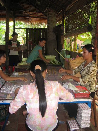 Nach einigen Stunden Busfahrt erreichten wir Mython City; wir stiegen auf ein Motorboot um, welches uns ueber einen breiten Flussarm des Mekongs zur Coconut Island brachte. Geschaeftig werden dort Coconut-Candies hergestellt, welche wie wir finden wirklich lecker schmecken! Das klebrige Zeug spuehlten wir mit einem kraeftigen Schluck Bananen-Schlangen-Schnaps hinunter (wobei wir von der Schlangenkomponente erst spaeter in Kenntnis gesetzt wurden...).