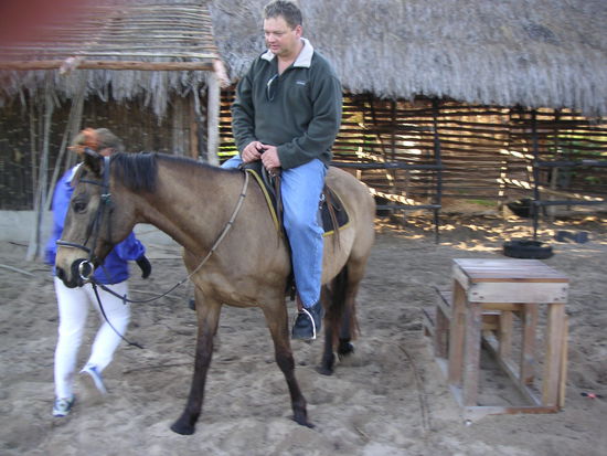 Eines wollte ich unbedingt heute morgen: Einen Ausritt am Strand ! Dies ist ganz in der Nähe der Barra Lodge möglich, eine nette Südafrikanerin betreibt dort einen Reitstall. Der Widerstand seitens meines Freundes war zwar schwach, aber er war da ! Er ist kein begeisterter Pferdefreund... Zwar bin auch ich keine erfahrene Reiterin, trotzdem liebe ich Pferde.