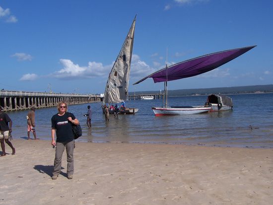 Den Ausritt am menschenleeren Strand genossen wir sehr. Etwa 1,5 Stunden waren wir unterwegs. Anschließend brachen wir das Zelt ab und fuhren nach Inhambane. Dort am Hafen konnten wir noch den anderen zusehen, wie sie mit einer Dhau lossegelten auf die andere Seite der Bucht nach Maxixe.