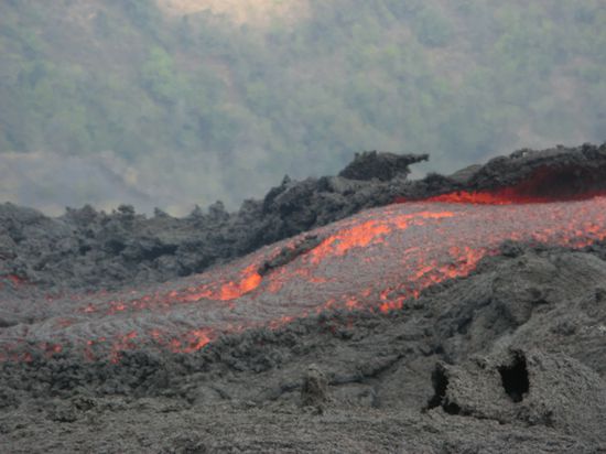 Zunaechst spuerten wir nur phasenweise Hitze aus dem Gestein aufsteigen. Dann jedoch traten wir bis auf wenige Meter an den Lavastrom heran. Spaetestens jetzt war auch Kati von dem Ausflug begeistert