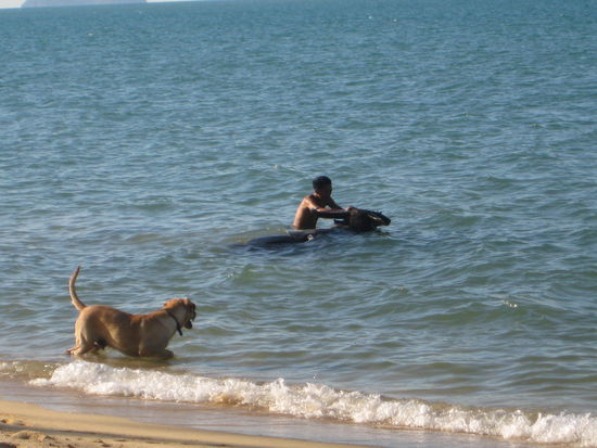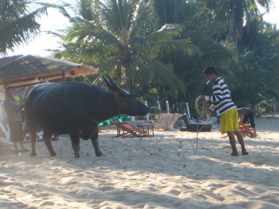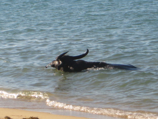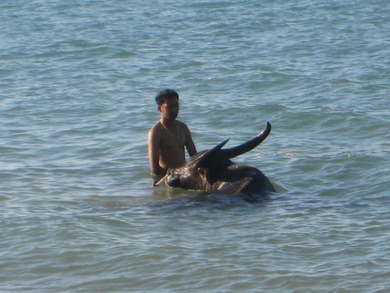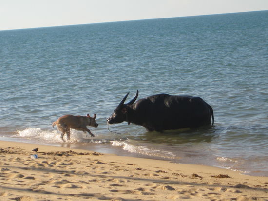 ...alle paar Tage kommt ein Thai mit seinem Carabao zum baden an den Strand. Was teilweise echt ulkig aussieht, besonders wenn dann noch der Hund vor dem Carabao rennt und es aussieht als moechte er mit ihm spielen.