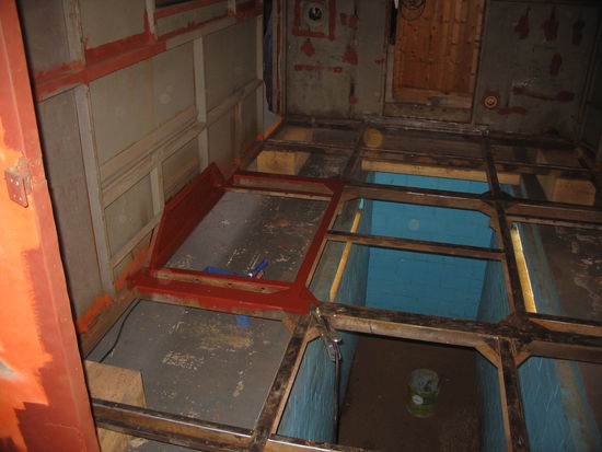 Nachdem der Lkw wieder läuft, konzentrieren wir uns als nächstes auf den Ausbau des Fernmeldekoffers. Als erstes haben wir den Koffer komplett entkernt und das Holz vom Fußboden entfernt. Dabei entdeckten wir wie erwartet viel Rost der zwischen dem Fußboden und Stahlträger entstanden ist. Also konnten wir wieder den Winkelschleifer ansetzen und stundenlang Rost abschleifen. Danach haben wir die Träger mit einer Rostschutzfarbe ( Rot ) grundiert.