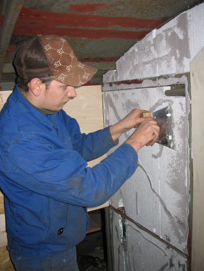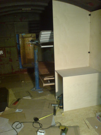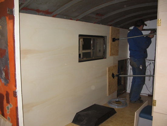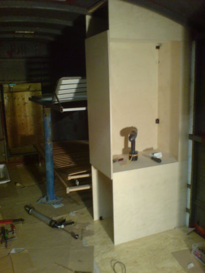 Damit uns im LKW nicht zu warm oder kalt wird, haben wir die Wände von innen mit Styropor verklebt. Zusätzlich haben wir noch eine Standheizung, die auch sehr nützlich sein kann. Auf das Styropor wird 3 mm Sperrholz verklebt. Die Holzarbeiten sind meiner Meinung nach sehr undankbar. Ich arbeite lieber mit Metall, da kann ich wenigstens auf Millimeter arbeiten.