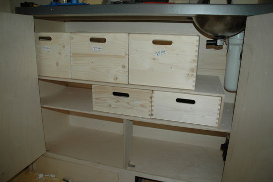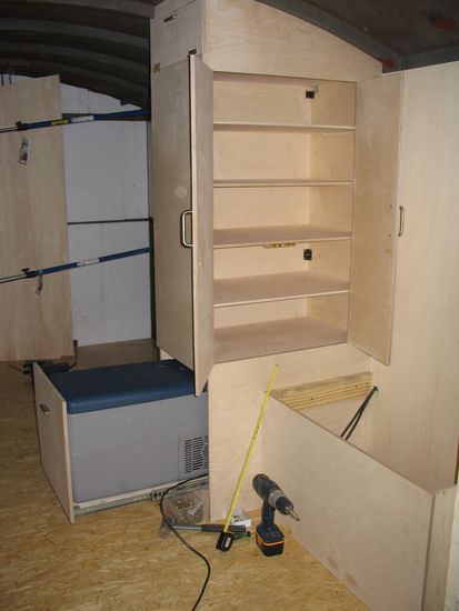 Wir können die Kühltruhe zur Küche hin rausziehen. Darunter ist noch eine Schublade. Oberhalb befindet sich ein Schrank, in den einiges reinpassen wird. Für den Schrankbau benutzen wir 12 oder 9 Millimeter Multiplex Platten. Dies ist ein super stabiles allerdings teures Holz.