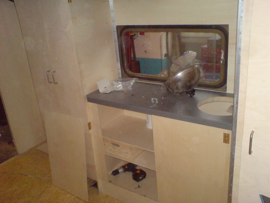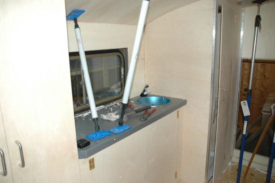 Hier entsteht gerade die super moderne Küche mit einem runden Waschbecken. Unter der Küche befindet sich noch der Radkasten. Somit ist der Platz super genutzt.