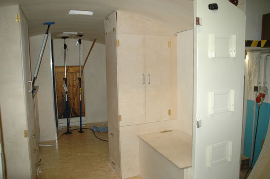 Vor die Betten kommt ein Schrank - kombiniert mit einer Sitzecke.
