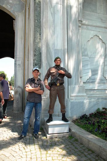 Diese Pose erinnerte mich ein wenig an meine Bundeswehrzeit. Super cooler Typ. Der verzog keine Miene. Fast wie vorm Buckingham Palace, nur das dies der Sultans Palast war, den wir besichtigt haben.