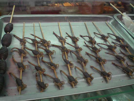 Im Anschluss sind wir wieder zu Fuss gen Hostel gelaufen und sind in der Wangfuying Snack Street Essen. Ein Abenteuer fuer sich. Eine kleine Gasse zwischen den grossen Shoppingmalls, die unzaehlige kleine Kuechen beherbergt, die Essen verkaufen. Neben gegrillten Maden gab es auch Spiesse mit Erdbeeren, Ananas, Fleisch und auch Skorpionen. Lecker! Auch dort haben wir wieder Nudelsuppe gegessen und waren die Attraktion fuer alle Chinesen.