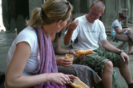 Nach Angkor Wat und Ta Prohm gönnten wir uns eine Pause und setzten uns in einen der zahlreichen Stände, die an den Straßen aufgebaut waren. Sofort kamen Kinder auf uns zu und wollten uns verschiedene Dinge verkaufen. Einige hatten Magneten mit Motiven von Angkor und wir fragten nach dem Preis. Es war klar, dass wir nun kaufen "mussten". Die Verhandlungskünster schafften uns immer etwas abzulocken Ein Mädchen fragte uns woher wir kommen und als Trinis Antwort "Germany" war, rief sie wie aus der Pistole geschossen "Capital Berlin". Nicht schlecht, dachten wir. Die Holländer wurden auch gefragt und schon kam "Capital Amsterdam". Nun frgate sie Maike und sie sagte "I am from Sweden" und promt kam "Capital Stockholm". Wir machten ein Spiel draus und fragten sie nach allen möglichen Hauptstädten. Sie wusste ziemlich viel, von Russland über Argentinien bis nach Costa Rica. Bei Nicaragua und einigen afrikanischen Ländern war ihr Wissen dann aber auch vorbei Am Ende kauften wir ihnen einige Magneten ab.