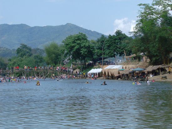 An einer Stelle des Flusses sah man unendlich viele Leute im Wasser. Die Stelle war sehr flach und alle Laoten waren gekommen, um dort zu feiern. Sie saßen am Rand, grillten oder hörten Musik oder waren im Wasser. Im Vergleich zu den Touristen waren alle komplett angezogen. Keiner - egal ob Mann oder Frau - trug einen Badeanzug!