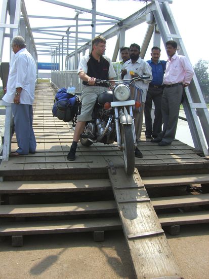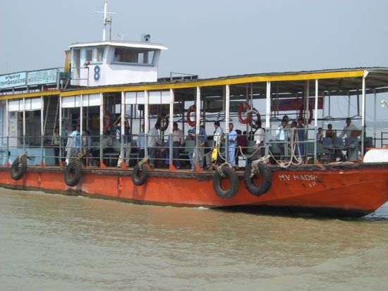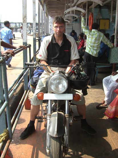 Aber wenigstens sind wir jetzt schon ueber den Hugli (der falsche Ganges) drueber. Kolkata liegt naemlich nicht am Ganges, sondern am Hugli - Vico Torriani hat uns da schoen belogen !!!!! Den (Hugli nicht Vico Torriani) haben wir bei Haldi mit einer Faehre ueberquert. Vorher haben wir die Enfield aber noch segnen lassen, nur fuer den Fall, dass die Faehre untergeht. Und ich habe meine Tschunken gesehen, die ich schon im Vietnam gesucht habe !! - Zumindest haben diese Boote von der Ferne so ausgesehen.
