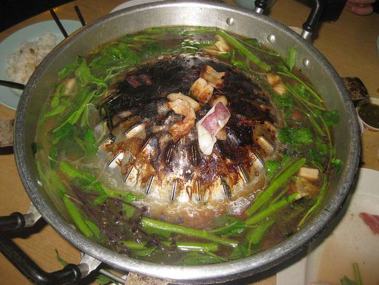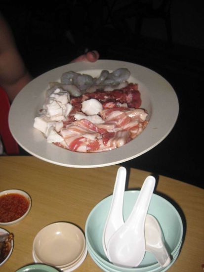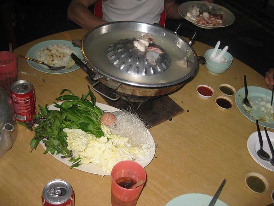 auf dem Hubbel in der Mitte wird das Fleisch und die Meeresfrüchte gebraten, der Bratensaft läuft in die Hühnerbrühe mit Lemongras, und man ißt dann praktisch das Fleisch und die Suppe, in der noch Glasnudeln, Chinakohl und andere superg'sunde Sachen rumschwimmen. Ein Festessen, und netter Zeitvertreib, für insgesamt 13 SGD inkl. Getränke....ein toller Abschied von Singapur, morgen früh geht's mit dem Bus nach Malaysia