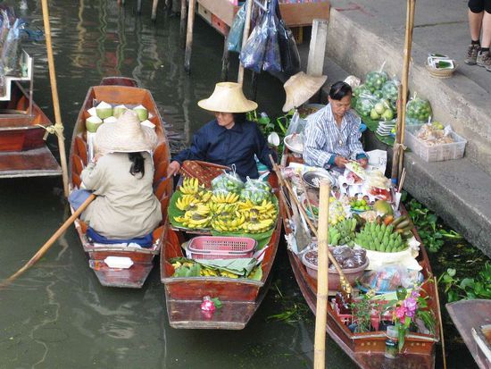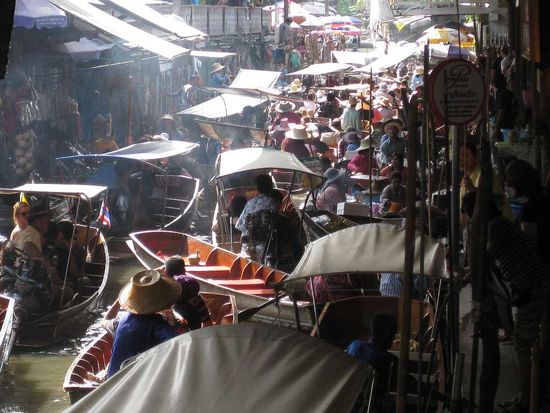 Der Lonely Planet sagt, dass man sich die floating markets unbedingt vor 7 Uhr anschaun soll, da sonst die Touribusse den Spass Verderben, aber da die markets ein gutes Stueckerl von bangkok weg sind und wir so viel wie moeglich in einen Tag packen wollen, haben wir uns doch fuer die organisierte Tour entschieden. Ich werde am Ende noch ein kleines Kapitel den Thais im speziellen widmen, und heute ist schon wieder so ein Tag.....aber zum Ausflug. Graesslich, haesslich!