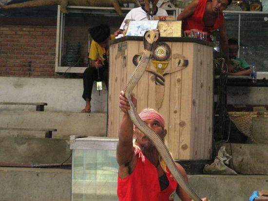 Uns ist das hier zu viel Gewusel und kaufen woll ma auch nix, also hoeren wir gebannt zu, als der Reisefuehrer anbietet, man koenne jetzt alternativ auf eine Kobra-Show fahren. Das haette ich zwar nicht als erste Wahl gehabt, aber warum nicht. Besser als hier in der Hitze zu stehen neben ein paar hundert anderen Schwitzenden, ist's allemal. Auf zur Kobra-Show.....ich konnte ja nicht wissen.....