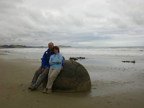 Da unser Übernachtungsziel Dunedin hieß, und diese an der Ostküste liegt, hatten wir noch einiges an Kilometern zu fahren. Eine Zwischenstation musste noch sein, und zwar an den Moeraki-Bouldern. Diese Gesteinsformationen sind vor 4 Millionen Jahren entstanden und schauen aus wie rießige Fußbälle.