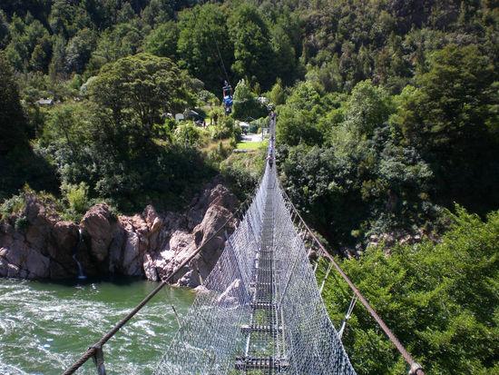 Die zweite Station war eine Hängebrücke, die mit ihren 110 Metern die längste in Neuseeland ist. Zudem geht man die gesamte Strecke auf einem Gitter, damit man den Abgrund immer schön vor Augen hat. Die Strecke zum anderen Ufer wurde anfangs noch mit eher weichen Knien zurückgelegt. Zurück fühlte man sich schon wie ein kleiner Indianer Jones, und wir konnten den Entgegenkommenden cool ausweichen.