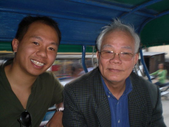 Long: Total erschoepft und mit einigen blauen Flecken machten wir uns auf die Suche nach einem Guesthouse. Natuerlich setzte uns der TukTuk-Fahrer gleich mal auf die teure Hauptstrasse. So irrten wir eine Weile herum. Als ich ploetzlich einen grauhaarigen Mann mit einer Frau sah. UNGLAUBLICH! Wir trafen meine Eltern, die eigentlich erst einen Tag spaeter kommen sollte. Das war schon eine Erleichterung da sie Laotisch sprechen. Mit ihrer Hilfe haben wir also ein Hotel um 15 Dollar die Nacht bekommen. Sehr toll. Hat schon seine Vorteile, vorallem weil hier "Falang"s auch ordentlich abgezockt werden.