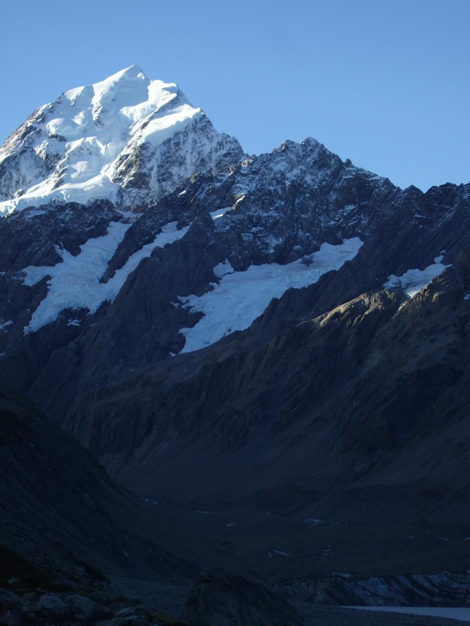 Typisch fuer Neuseeland ist, dass man auf so eine Natur in geringeren Hoehenlagen als zum Beispiel in den Alpen trifft. Allerdings ist der Mount Cook auch 3754 Meter hoch und damit der hoechste Berg Neuseelands!