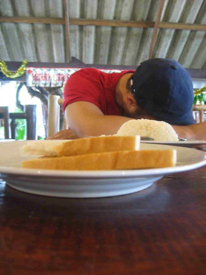 Und so ging's uns am nächsten Morgen: Frühstück mit Toastbrot und Reis...