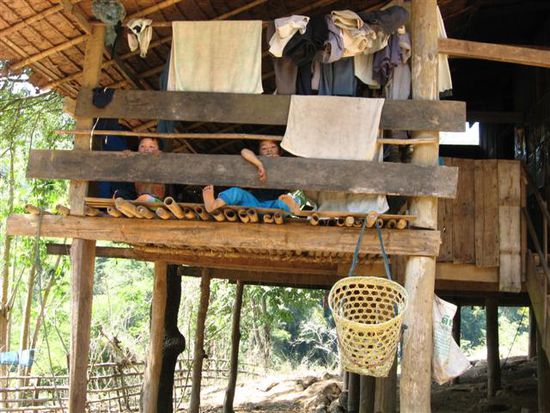 Nach einer wenigstuendigen Trekkingetappe durch den Urwald gelangten wir auch schon im Dorf der Karen an, wo die erste Uebernachtung geplant war. Dort genossen wir das herzliche Zusammenleben von Kindern und Eltern, Hausschweinen, Hennen/Haehnen, Hunden, Katzen und dergleichen (wie zB uns Touristen...) in einfachen Holzbauten.