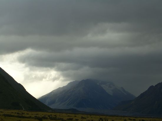 Vom Lake Tekapo ging es dann weiter Richtung Mt.Cook, dem groessten Berg NZ mit ueber 3700m Hoehe. Man faehrt praktisch eine 55km lange einbahnstrasse hinein und hofft, dass das wetter entsprechend schoen ist, dass man was sehen kann. Leider ist es ab diesem tag jeden tag schlechter geworden und wie befuerchtet haben wir nicht viel vom berg gesehen ausser wolken.