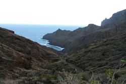 Über eine Mountainbike-Strecke setzen wir unsere Wanderung fort und erreichen später wieder den Wanderweg 3.1, der uns zurück nach Hermigua führt. Hierbei gilt es die erklommene Höhe von etwa 900 Höhenmetern wieder hinabzusteigen. Es werden uns schöne Ausblicke auf das von der Sonne angestrahlte Tal und die im Dunst liegende Insel Teneriffa geboten.