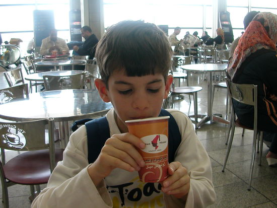 Gegen 10 Uhr erreichen wir den Flughafen, kaufen noch ein paar schoene Dosen mit Suessigkeiten und checken dann ein. Alles verlaeuft ganz problemlos, ich trinke gemuetlich im Meinl-Kaffeehaus einen Latte und wir lassen uns die Mehlspeisen schmecken.