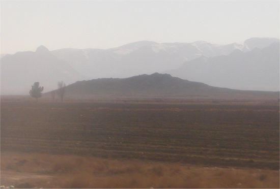 Heute ereignet sich nicht viel. Die Strecke von Isfahan nach Shiraz betraegt nur 400 km, aber der Bus braucht trotzdem an die 7 Stunden, weil er nur 100 km/h faehrt und noch dazu in den groesseren Orten haelt. Die Kinder spielen Gameboy und ich schaue mir die Landschaft und die Orte an. Wir fahren durch ein sehr breites Tal, gesaeumt von schneebedeckten Bergen, in dem sehr viele Industriebetriebe angesiedelt sind, die ich allerdings nur aus der Ferne sehe.