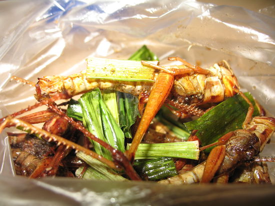 Sie grinst mich an und bestellt ne Portion Heuschrecken, die mich gerade mal 20 Baht kostet. die Heuschrecken werden noch kurz in heissem Oel geschwenkt, etwas Gruenzeug und Gewuerz dazu und fertig ist die leckere Mahlzeit.