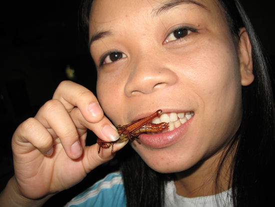 Als ich so durch die Strassen schlendere, sehe ich wieder einen Handkarren mit Allerlei Insekten, die dort angeboten werden. Kaefer, die halb so gross sind wie meine flache hand und schoene grosse Heuschrecken. Als ich mir das so betrachte, sehe ich wie neben mir eine Thai grosse Augen macht bei all diesen Koestlichkeiten, und ich fange ein Gespraech mit ihr an: