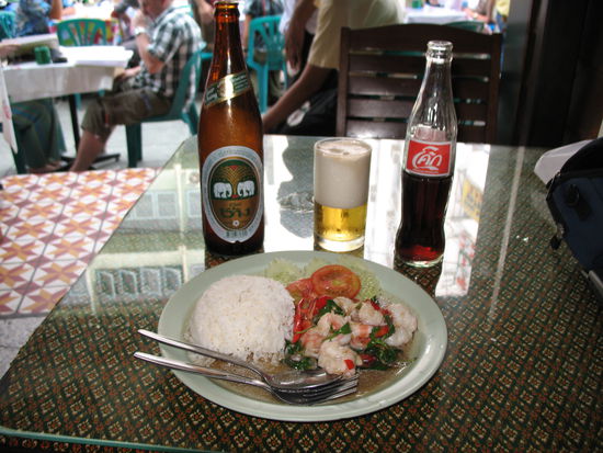 Auf den Durian gibt es am naechsten Tag zum Fruehstueck leckere Krabben mit Reis und Gemuese, dazu ein Chang Bier und ne Cola