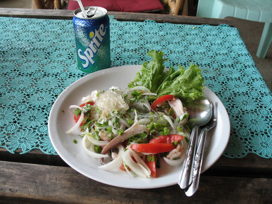 Am naechsten Morgen esse ich zum Fruehstueck einen leckeren Thai Seafood Salat, very spicy, also scharf wie es die Thais moegen. Wirklich sehr lecker mit Glasnudeln. Dazu ne Sprite fuer zusammen rund 2 EUR.